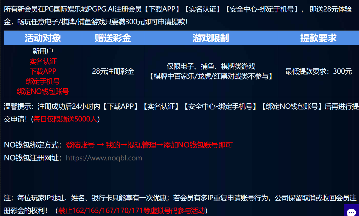 新用户注册下载APP绑定手机号和NO钱包送28 仅限电子、捕鱼、棋牌类游戏【棋牌中百家乐/龙虎/红黑对战类不参与】最低提现300