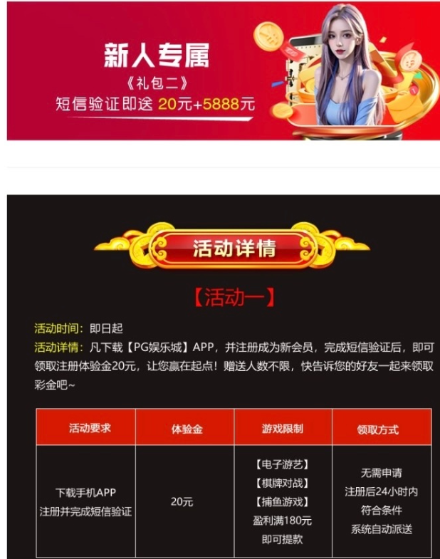 活动详情:新用户注册完善个人信息需下载平台APP完成短信验证自动送20彩金 限制电子 棋牌 捕鱼 满180即可提现
